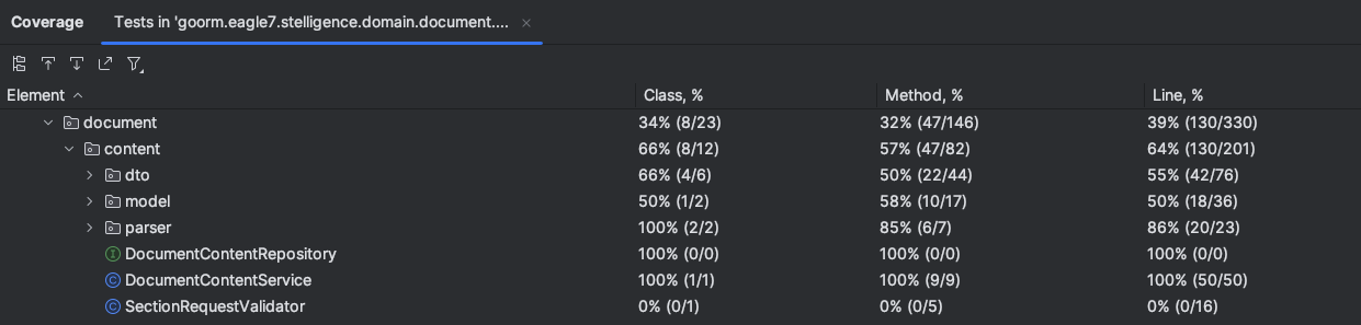 ํ ์คํธ๊ฐ ์ข ๋ฃ๋๊ณ ๋๋ฉด ํญ์ด ํ๋๊ฐ ๋จ๋๋ฐ, ๊ทธ ๊ณณ์์ Class Coverage, Method Coverage, Line Coverage๋ฅผ ๋ณผ ์ ์์ด์ ๋ณ๋์ ์ค์ ์์ด ๊ฐ๋จํ๊ฒ ํ์ธํ๊ธฐ์ ์ข์ ๋ฐฉ๋ฒ์ ๋๋ค.
