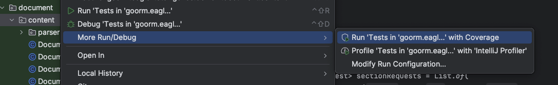 Jacoco์ ๊ฐ์ ์ธ๋ถ ๋ผ์ด๋ธ๋ฌ๋ฆฌ๋ฅผ ๋์ ํ์ง ์๊ณ ๋ Intellij๋ฅผ ์ฌ์ฉํ๋ค๋ฉด ๊ฐ๋จํ๊ฒ ์ปค๋ฒ๋ฆฌ์ง๋ฅผ ๋ณผ ์๋ ์์ต๋๋ค. ์ํ๋ Test Suite์์ More Run/Debug -> Run Test in ... With Coverage๋ฅผ ํตํด ์คํํด์ฃผ๋ฉด ๋ฉ๋๋ค.