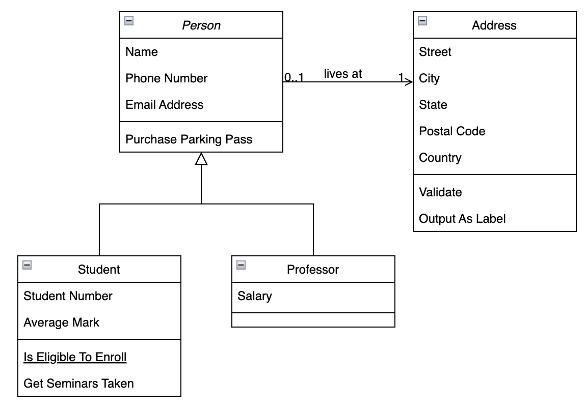 ์ ๋ค์ด์ด๊ทธ๋จ์ ํด๋์ค์ ๊ทธ๋ค๊ฐ์ ์์กด ๊ด๊ณ๋ฅผ ๋ณด์ฌ์ค๋๋ค. Person์ Address๋ฅผ ๊ฐ์ง๊ณ ์์ผ๋ฉฐ ์ด์ ํ์ ํ์ฌ ๋์ํฉ๋๋ค. Person์ Association์ด๋ผ๋ ๊ด๊ณ ํ์ฑ์ ํตํด Address์ ์์กดํฉ๋๋ค. Person์ ์ถ์ ํด๋์ค์ด๊ธฐ์, Student์ Processor์ ๊ฐ์ ํด๋์ค๋ Person์ ์์ํ๊ณ ์์ต๋๋ค. Student์ Professor๋ ์์์ด๋ผ๋ ๊ด๊ณ๋ฅผ ํตํด Person์ ์์กดํฉ๋๋ค.
