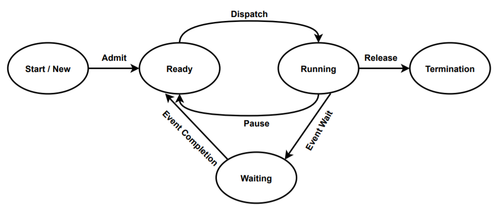 Start ํน์ New ์ํ๋ ํ๋ก์ธ์ค์ ์์ฑ์ ์์ฒญ๋ฐ์ ํ์ํ ์ด๊ธฐํ๋ฅผ ํ๋ ์ํ๋ฅผ ์๋ฏธํฉ๋๋ค. ์ดํ ์ํ๋๊ธฐ ์ํ ๋ชจ๋ ์ค๋น๊ฐ ์๋ฃ๋๋ฉด ํ๋ก์ธ์ค๋ Ready ์ํ๋ก ๋ฐ๋๋๋ค.